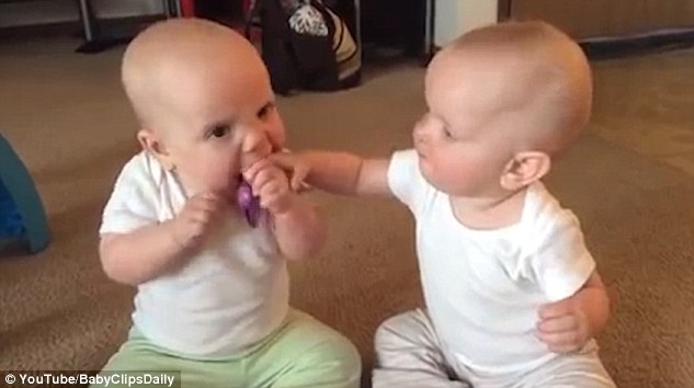 But it's the one in green who seems to win the feud, after she takes back the pacifier and then realises she can turn her head away from her sister's grasp