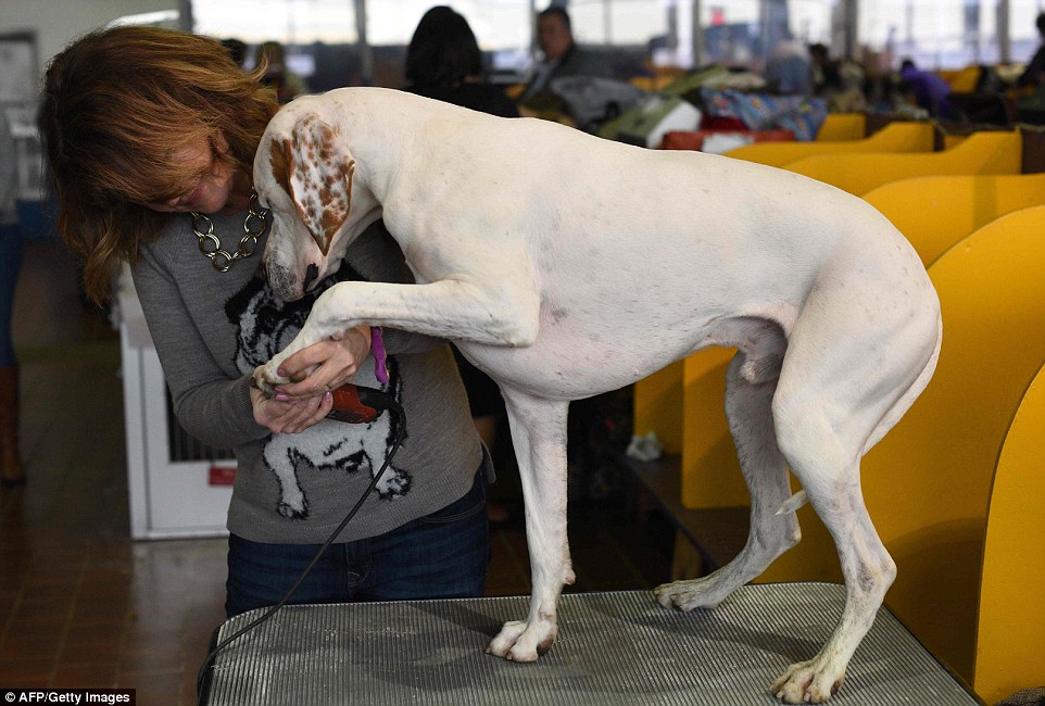 A Pointer gets a manicure in the benching and grooming area of the competition