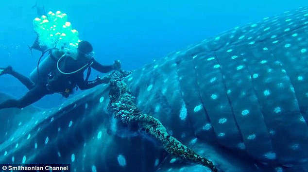 It takes just thirty seconds for the diver to remove the rope which may have tortured the gentle giant for years.