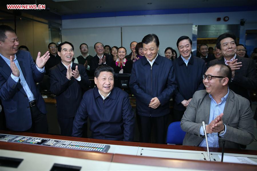 BEIJING, Feb. 19, 2016 -- Chinese President Xi Jinping is shown the studio where China Central Television (CCTV) Evening News Bulletin, or "Xinwen Lianbo," is filmed at the headquarters of CCTV in Beijing, capital of China, on Feb. 19, 2016. Xi on Friday visited the People's Daily, Xinhua News Agency and CCTV, the nation's three leading news providers. (Xinhua/Lan Hongguang)