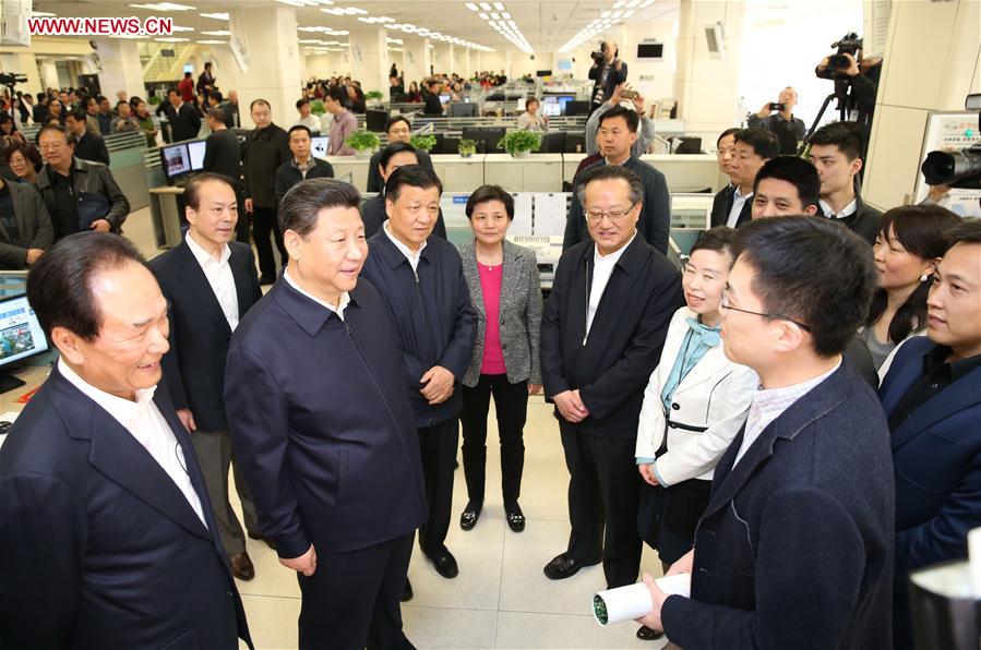 BEIJING, Feb. 19, 2016 -- Chinese President Xi Jinping (2nd L, front) talks with a correspondent who is just back from reporting in Zhengding County of Hebei Province, at the headquarters of Xinhua News Agency in Beijing, capital of China, on Feb. 19, 2016. Xi on Friday visited the People's Daily, Xinhua News Agency and China Central Television, the nation's three leading news providers. (Xinhua/Huang Jingwen)