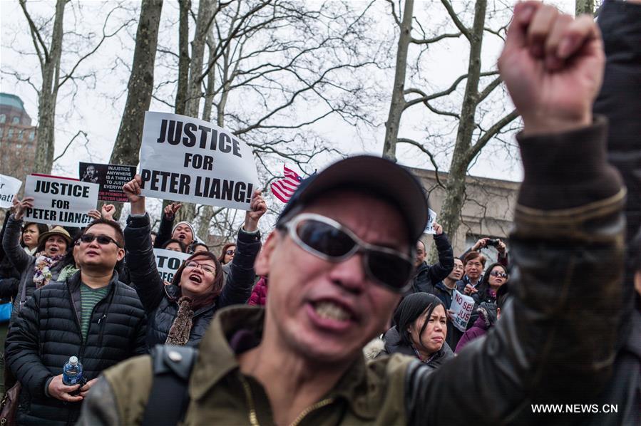 People take part in a rally in support of New York City Police officer Peter Liang, at Brooklyn's Cadman Plaza Park, in New York, the United States, Feb. 20, 2016. Peter Liang, a New York City police officer of Chinese descent, was found guilty on Feb. 11 of manslaughter over the shooting of a black man, prompting concerns of discrimination. On Nov. 20, 2014, Liang, a 27-year-old with only a year and a half on the job, was patrolling with his partner in Brooklyn's East New York housing project when he was startled by a noise. In a stairway that prosecutors described as "pitch-dark," Liang drew his gun and fired. The bullet ricocheted off a wall and hit Akai Gurley on a lower level. (Xinhua/Li Muzi)