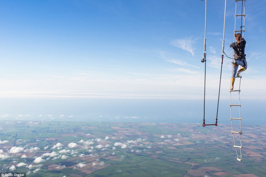 Anna Cochrane is pictured climbing down the rope ladder suspended from beneath the hot air balloon, to step onto the trapeze