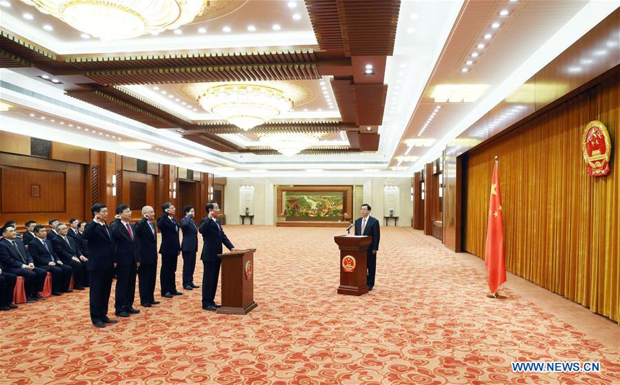 BEIJING, Feb. 26, 2016 -- Zhang Dejiang (R), chairman of the National People's Congress (NPC) Standing Committee, presides over an oath-taking ceremony for six new officials with special committees of the NPC and commissions of the NPC Standing Committee at the Great Hall of the People in Beijing, capital of China, Feb. 26, 2016. (Xinhua/Yao Dawei)