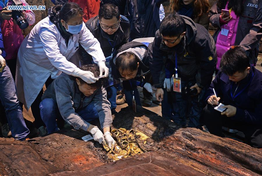 Archaeologists clear gold cakes unearthed from the main coffin in the Haihunhou (Marquis of Haihun) cemetery, east China's Jiangxi Province, Dec. 24, 2015. There were 96 gold cakes and several hoof-sahped golds newly unearthed between the inner and external coffin at the Haihunhou cemetery on Dec. 24, making the number of gold cakes unearthed here rise to 285, the most among all archaeological excavations of the Han Dynasty (206 B.C.-220 A.D.) tombs. (Xinhua file photo/Wan Xiang)