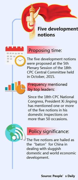 The five notions, defined at the 5th Plenary Session of the 18th CPC Central Committee last October, have become a guideline for China’s 13th Five-Year Plan, a roadmap for the nation's development from 2016 to 2020.