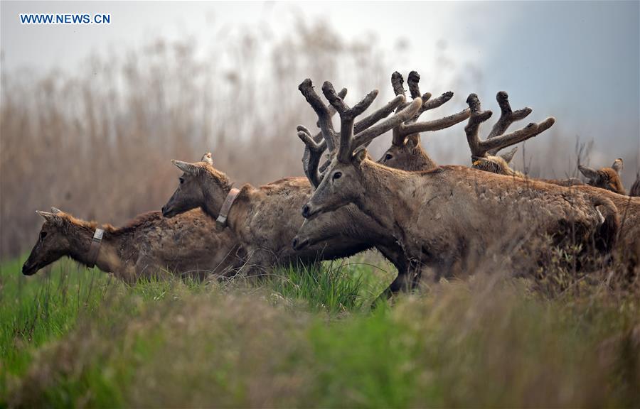 Mooses run at the East Dongting Lake National Nature Reserve, central China's Hunan Province, March 3, 2016. 16 mooses from the Dafeng Moose National Nature Reserve of Jiangsu Province were released to the East Dongting Lake National Nature Reserve of Hunan Province on Thursday. (Xinhua/Li Ga)