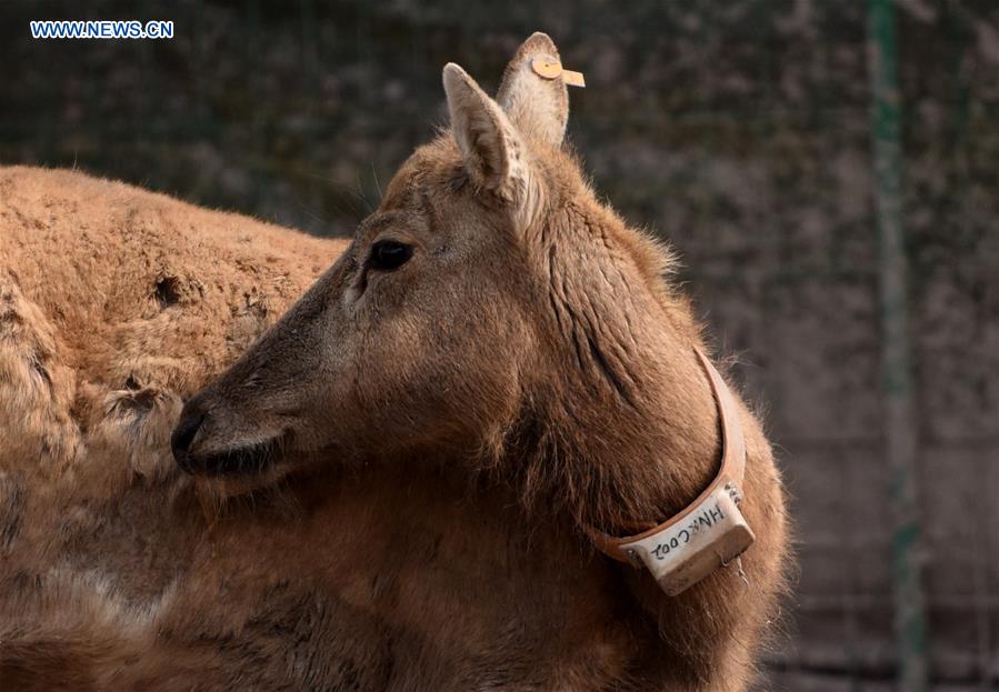A moose wears a location equipment on its neck before being released to the East Dongting Lake National Nature Reserve, central China's Hunan Province, March 2, 2016. 16 mooses from the Dafeng Moose National Nature Reserve of Jiangsu Province were released to the East Dongting Lake National Nature Reserve of Hunan Province on Thursday. (Xinhua/Li Ga)