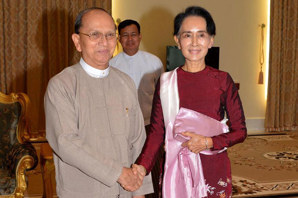 Myanmar President U Thein Sein (L) meets with Aung San Suu Kyi, chairperson of the election-winning opposition National League for Democracy, at the Presidential Palace in Nay Pyi Taw Dec. 2, 2015. [File Photo: Xinhua/Myanmar News Agency]