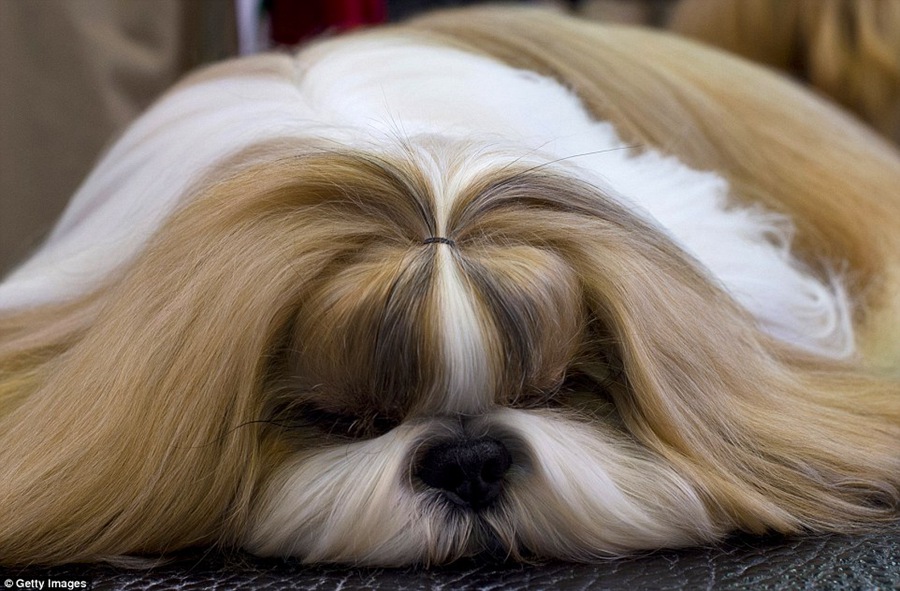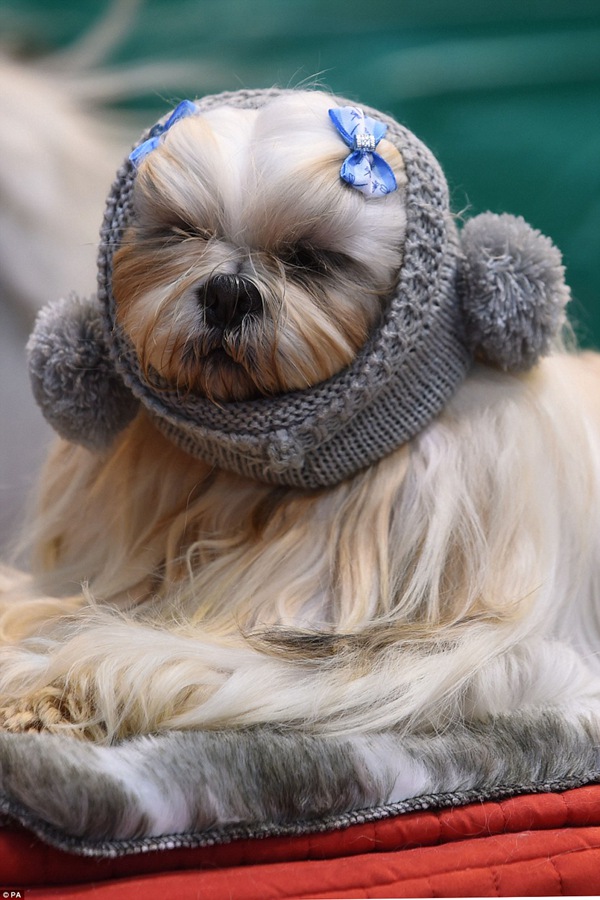 Lhasa Apso named Casper wears a wooly hat. Today was the toy and utility breeds competition