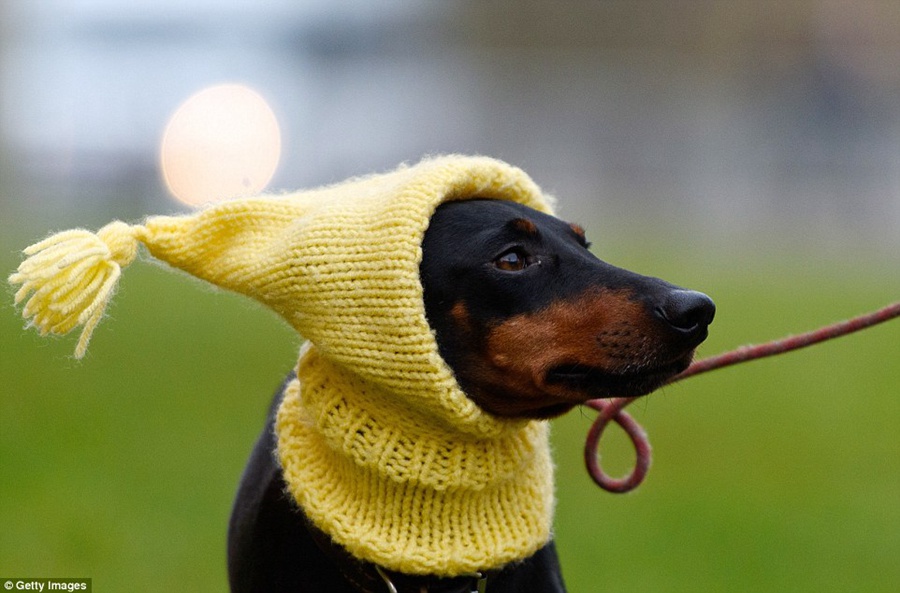 Mable the Manchester Terrier was wrapped up warm against the cold in a yellow knitted hat before entering the show