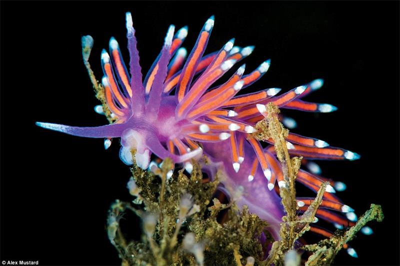 The image is of a colourful nudibranch (Flabellina pedata), a type of mollusc, sometimes called a seaslug. The bright colours are a warning, that this slow moving creature is not to be trifled with. It feeds on hydroids, which have powerful sting. This image was taken in Loch Carron, Scotland