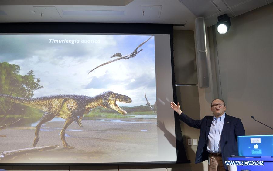 Hans Sues, chair of the Department of Paleobiology at the Smithsonian's National Museum of Natural History, talks about a new dinosaur, Timurlengia euotica, at a news conference in Washington D.C., the United States, March 14, 2016. Scientists said Monday they have discovered the fossilized remains of a new horse-sized dinosaur that revealed how Tyrannosaurus rex (T. rex) became one of Earth's top predators about 70 to 80 million years ago. (Xinhua/Yin Bogu)