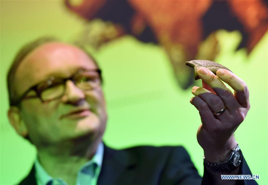 Hans Sues, chair of the Department of Paleobiology at the Smithsonian's National Museum of Natural History, holds up a claw of a new dinosaur, Timurlengia euotica, at a news conference in Washington D.C., the United States, March 14, 2016. Scientists said Monday they have discovered the fossilized remains of a new horse-sized dinosaur that revealed how Tyrannosaurus rex (T. rex) became one of Earth's top predators about 70 to 80 million years ago. (Xinhua/Yin Bogu)
