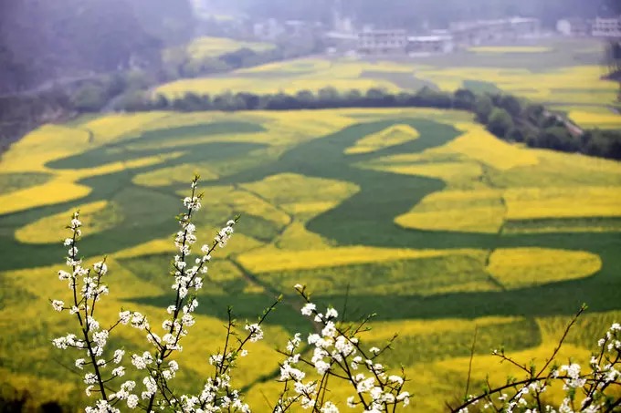 As days get warmer, rapeseed flowers bloom into sea across China. Photos taken on March 12, 2016 show a giant Chinese character meaning “dragon” (龍) drawn in an 80,000-square-meter rapeseed flower field in Anshui, southwest China’s Guizhou province.