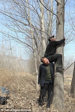 Partnership working: Blind Mr Haixa scales a tree with the help of Mr Wenqi, so that he can find fresh cuttings to plant in the ground