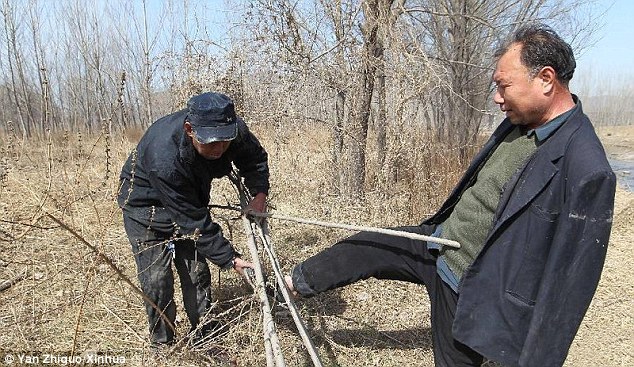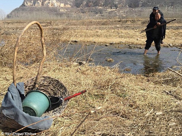 Companions: Mr Wenqi carriers his blind colleagues across the river before they can begin their days work