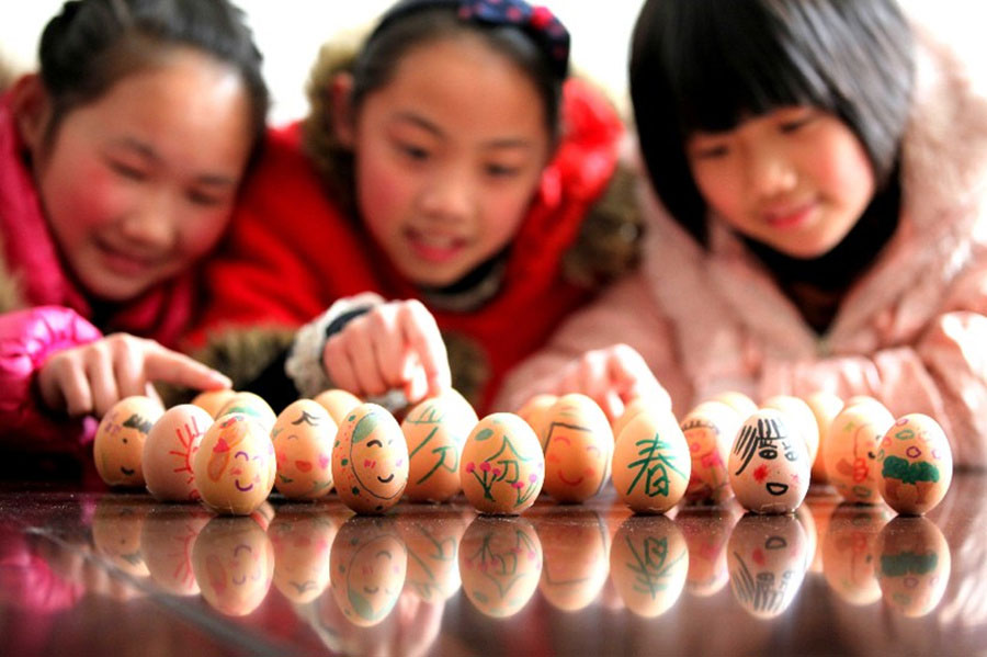 Standing an egg upright is a popular game across the country during the Spring Equinox. It is an old custom that dates back to 4,000 years ago. People practice this tradition to celebrate the coming of spring. It is believed that if someone can make the egg stand, he will have good luck in the future.
