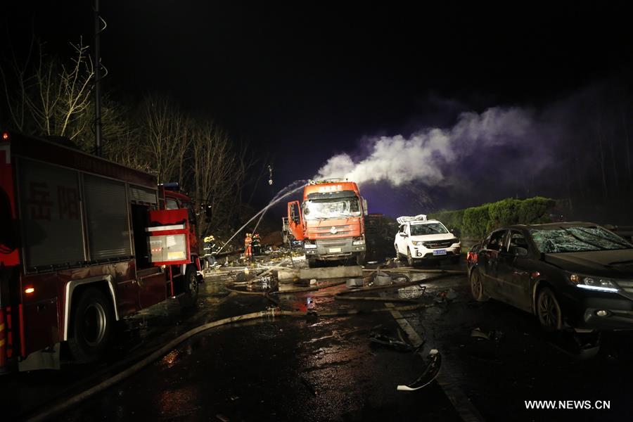 Fire fighters work at the explosion site on a section of the highway linking Beijing to Hong Kong and Macao, in Yueyang City, central China's Hunan Province, March 20, 2016. Five people died and twenty others were injured after a truck exploded on the highway on Saturday, according to local authorities. [Photo: Xinhua/Li Ga]