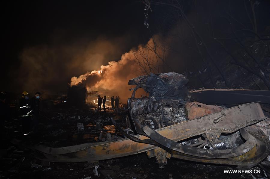 YUEYANG, March 20, 2016 -- Fire fighters work at the explosion site on a section of the highway linking Beijing to Hong Kong and Macao, in Yueyang City, central China's Hunan Province, March 20, 2016. Five people died and twenty others were injured after a truck exploded on the highway on Saturday, according to local authorities. (Xinhua/Li Ga)