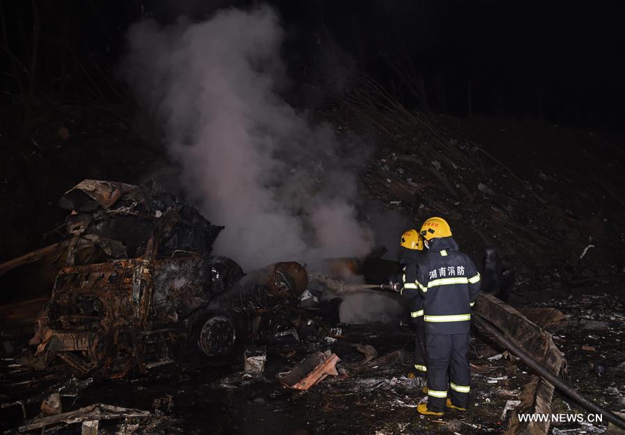 YUEYANG, March 20, 2016 -- Fire fighters work at the explosion site on a section of the highway linking Beijing to Hong Kong and Macao, in Yueyang City, central China's Hunan Province, March 20, 2016. Five people died and twenty others were injured after a truck exploded on the highway on Saturday, according to local authorities. (Xinhua/Li Ga)