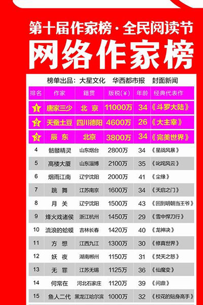 "Such novels pose a sharp contrast to our daily life, which satisfies the readers' craving for a life different from what they're leading," said Wu Huaiyao, initiator of the ranking list.
