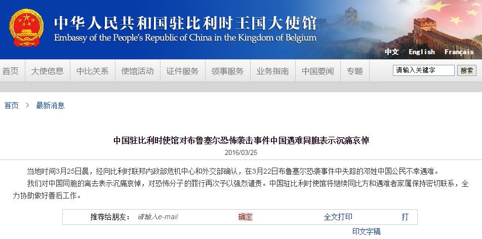 The Chinese embassy in Belgium said on its official website that a Chinese national is among those killed in Brussels terror attacks.