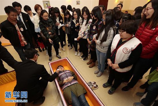 The visitor lies in a coffin to “experience” death. (Photo/Xinhua)