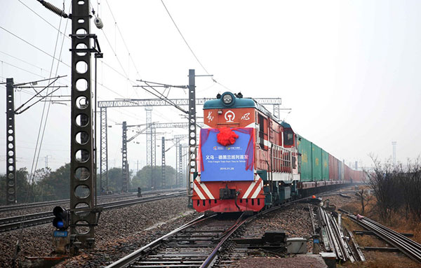 The first YXE international container train travelling from China's Yiwu to Iran's Teheran as part of "The Silk Road Economic Belt" and "The 21st Century Maritime Silk Road" strategy, also known as "One Belt, One Road", departs from a container terminal in Yiwu city, east China's Zhejiang province, 28 January 2016. [Photo: ImagineChina]