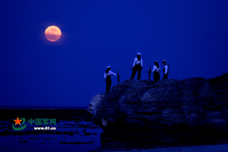 Soldiers stationed in the Xisha Islands watch the moon. (Photo/www.81.cn)