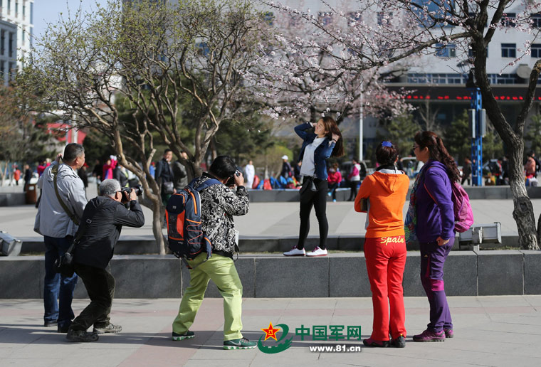 Girls take photos in Renmin Park in Benxi city, northeast China’s Liaoning province. (Photo/www.81.cn)