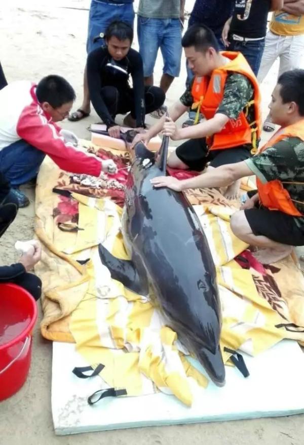 The injured mammal was spotted struggling miles away from a pier in Wanning on Monday by a veteran fisherman, who reported the case to local authorities.