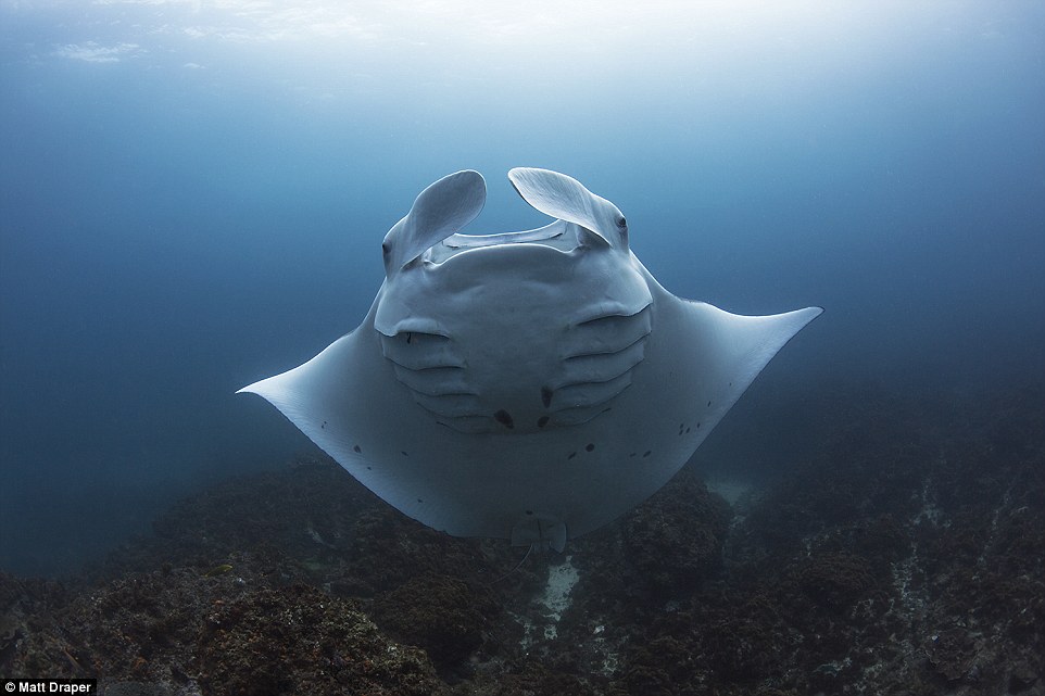 Draper's images showcase encounters with great white, tiger and hammerhead sharks, humpback and pilot whales, common and bottlenose dolphins, seals, turtles and manta rays, to name a few. Pictured is a manta ray in Byron Bay, Australia.