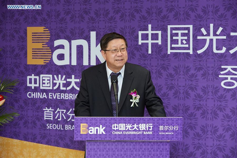 SEOUL, April 20, 2016 -- Tang Shuangning, chairman of China Everbright Group, addresses the opening ceremony of Seoul Branch of China Everbright Bank in Seoul, capital of South Korea, on April 20, 2016. The opening ceremony marked China Everbright Bank's official entering in the market of South Korea. (Xinhua)