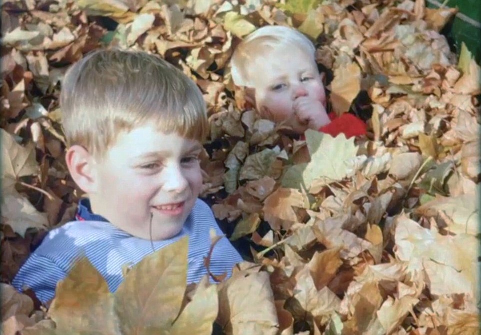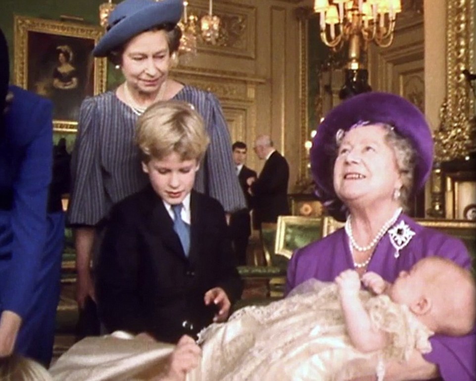 And William and Harry laugh about their cousin Peter Phillips’s shock of blonde hair as he stands with the Queen and the Queen Mother