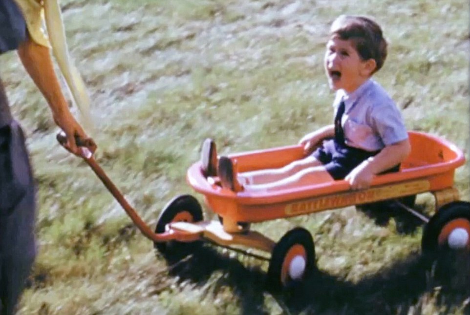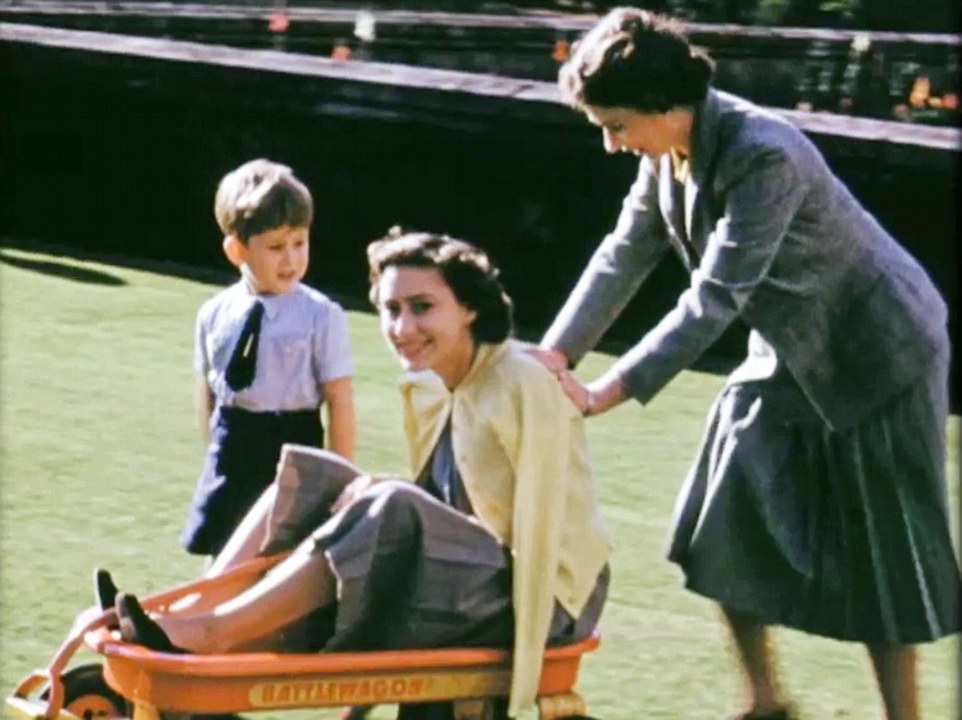 A joyful Princess Margaret is seen pulling a young Prince Charles in a trolley at Balmoral Castle in Aberdeenshire