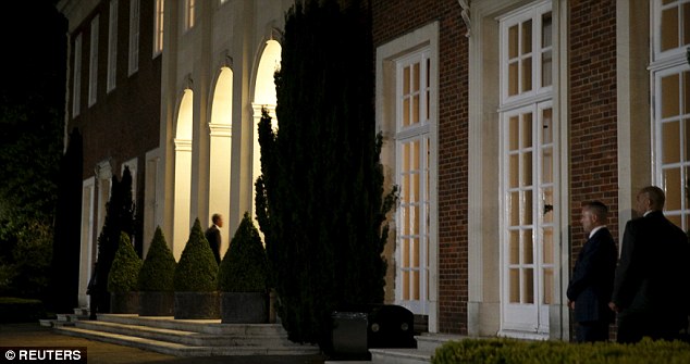US Secret Service agents watch on as the president and his entourage walk into into Winfield House, the U.S. Ambassador's residence, following a quick helicopter flight from Stansted Airport