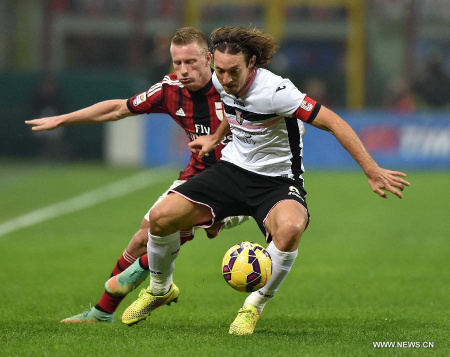 Ignazio Abate (L) of AC Milan vies with Edgar Barreto of Palermo during their Serie A football match in Milan, Italy, on Nov. 2, 2014. AC Milan lost 0-2. (Xinhua/Alberto Lingria)