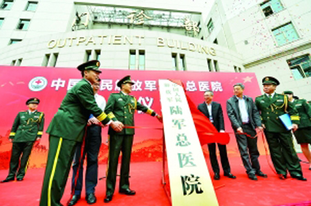 The General Hospital of Beijing Military Region was officially renamed as Army General Hospital of PLA on May 5. A nameplate unveiling ceremony was held in front of the outpatient service building to commemorate the occasion.