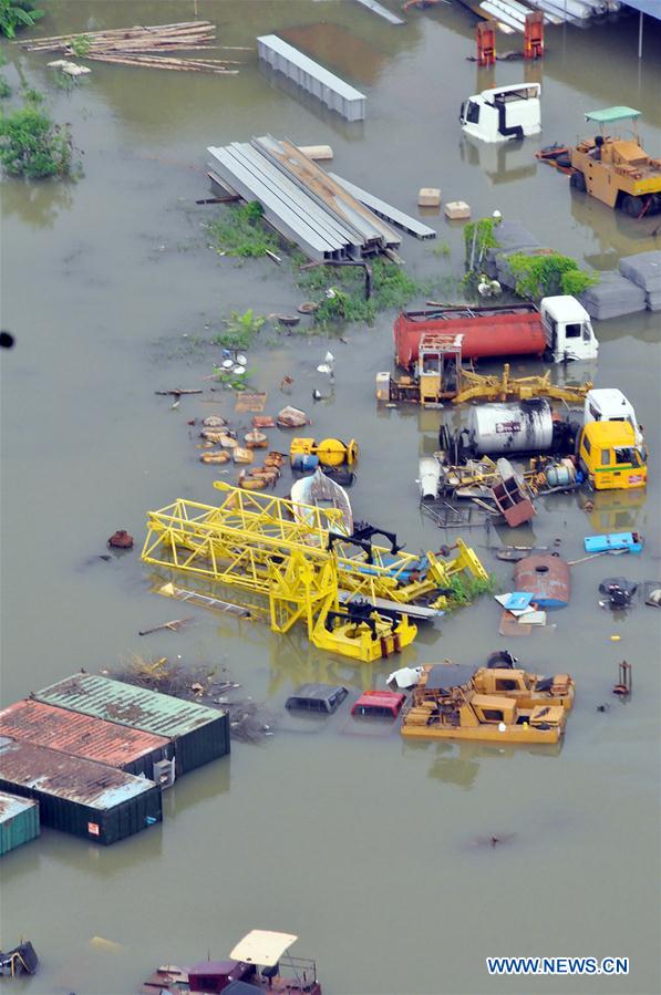 Photo taken on May 19, 2016 shows a bird's-eye view of flooded Kelaniya District, Sri Lanka. The death toll from Sri Lanka's flash floods and landslides rose to 63 on Friday as water levels in many districts continued to rise owing to heavy rains, the Disaster Management Center said. (Xinhua/Ajith Perera)