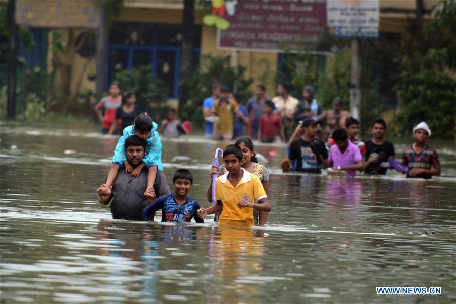 People make their way through floodwaters in Kelaniya District, Sri Lanka, on May 19, 2016. The death toll from Sri Lanka's flash floods and landslides rose to 63 on Friday as water levels in many districts continued to rise owing to heavy rains, the Disaster Management Center said. (Xinhua/Gayan Sameera)