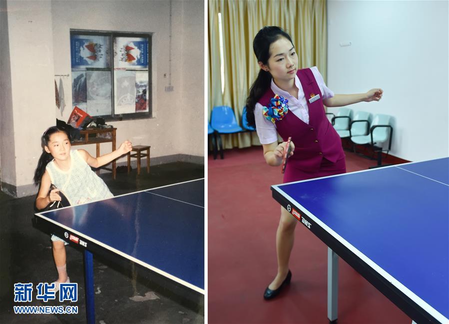 Nine-year-old Zhao Yanqing plays Ping-Pong in 2000, and the 25-year-old Zhao who is a stewardess of bullet trains. (Xinhua/Song Weiwei)