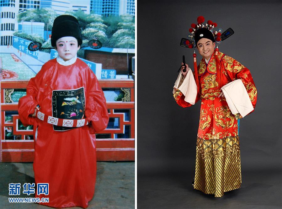 30-year-old Li Yibo poses in Peking Opera costumes to replicate a photo he took in 1992. (Photo/Xinhua)