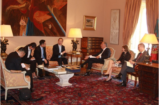 Portuguese PresidentMarceloRebelo de Sousa poses for photo together with Yang Zhenwu, President of People's Daily, and Cai Run (1st from the left), Chinese Ambassador to Portugal in Lisbon, capital of Portugal on Tuesday. (Photo: Yang Xuebo from People’s Daily)
