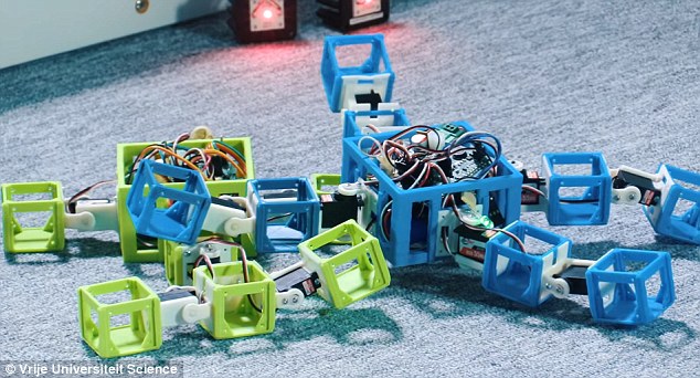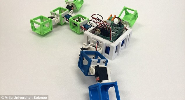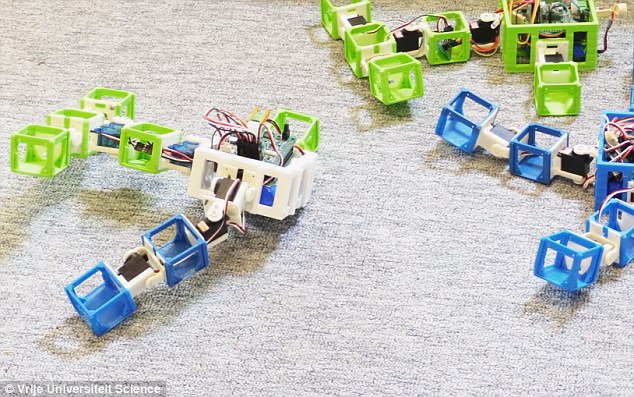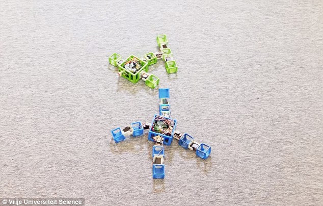 Scientists have developed a way for robots to have 'sex' and pass on their DNA to offspring. Doing this can allow them to 'develop their bodies through evolution,' making for successive generations that have more advanced physical and behavioural capabilities. Parent robots are pictured above