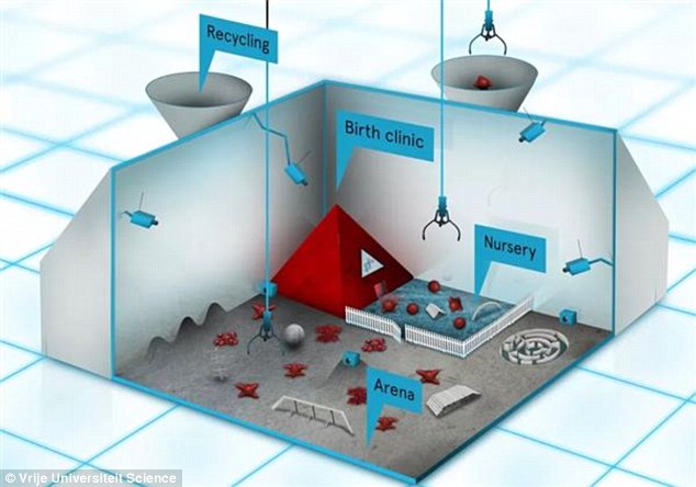The robots live, work, and reproduce in an 'Arena,' where they are able to select a suitable mating partner. The lab also contains a 'Birth Clinic' and a 'Nursery' for the robotic child, and once born, each must undergo a learning process. If it is deemed satisfactory, the child then becomes an adult, and potentially, a parent