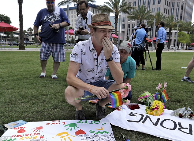 Emotiona: Jonthan Dalton breaks down as he places a flower on a makeshift memorial (above) in Orlando honoring two of his friends who died