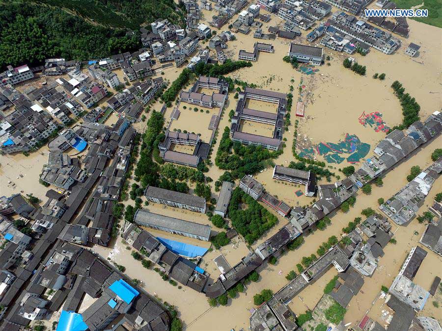 XIANGXI, June 22, 2016  -- An aerial photo taken on June 21, 2016 shows Liye Township is submerged by flood in Longshan County, central China's Hunan Province. A torrential rainfall lasting from June 18 to 20 caused dyke breach along the Youshui River in Liye Township, flooding many residential buildings. (Xinhua/Zeng Xianghui)