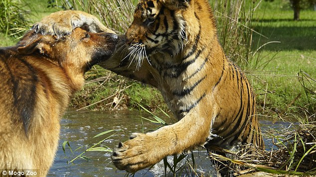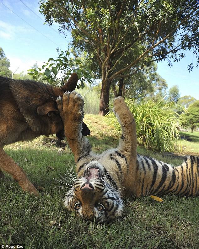 Kinwah (right) the Sumatran Tiger and Rumble (left) the German Shepherd have been playmates for years