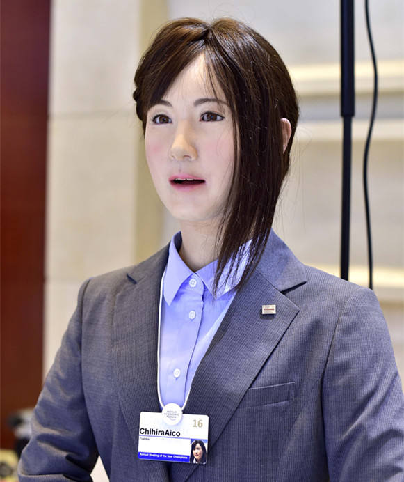Toshiba's humanoid robot Junko Chihira can speak three languages and works in a mall. She can exchange with consumers in accordance with the preset language and contents.